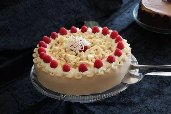 7. Når fromagen er stivnet fjernes springformen forsigtigt og kageplasten fjernes, kagen placeres på det fad du senere vil servere kage på .