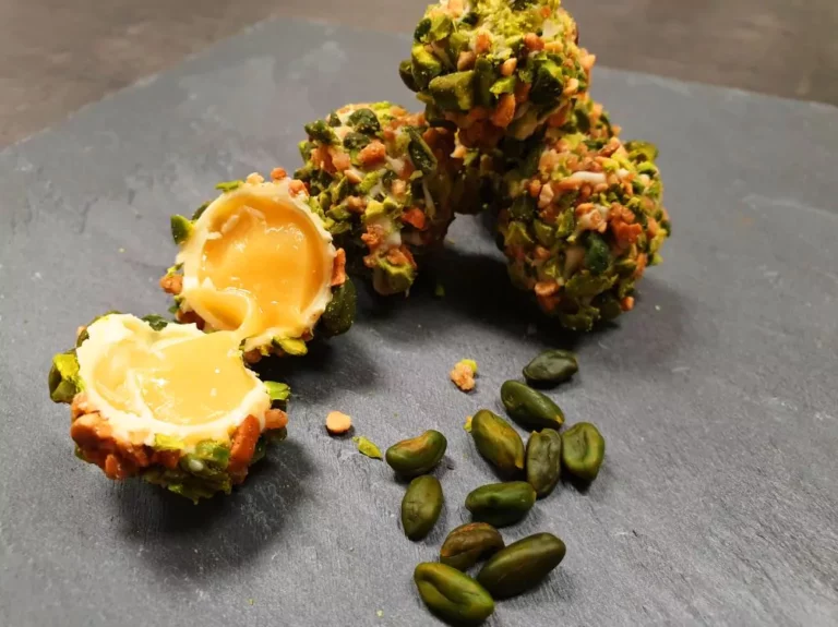 I den tempererede chokolade dyppes trøffelkuglerne og ruller dem herefter med det samme i de hakkede pistaciekerner der er blandet med krokant.