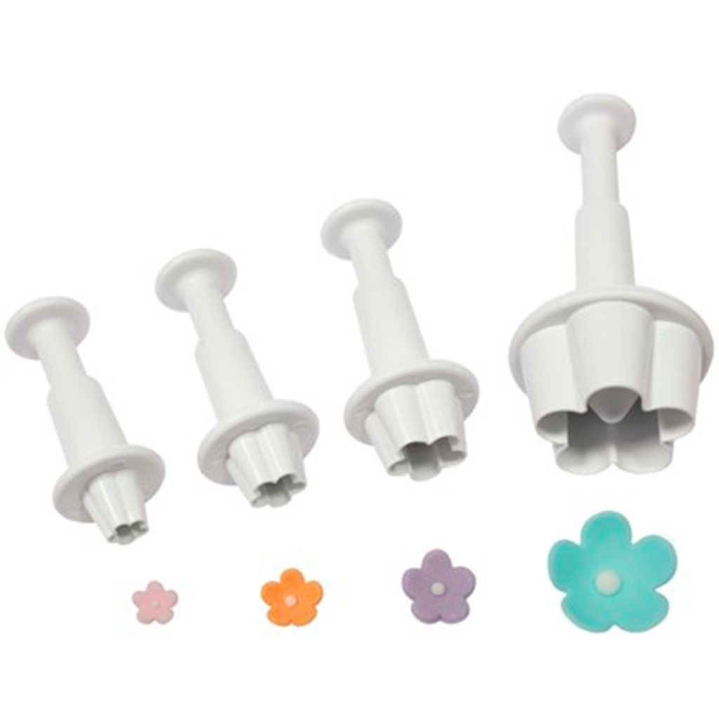 Plungere bruges til at skabe din egen pynt til kager og desserter nemt og hurtigt. Plungere bruges sædvanligvis med fondant eller gumpaste, der kan indfarves i lige den nuance, du ønsker med vores mange fødevarefarver eller farves bagefter med farvepulver. Rul fondanten ud i ønsket tykkelse, hvorefter du presser plungeren ned i fondanten. Bevæg plungeren rundt i cirkel, så overskydende fondant slipper og du få en helt skarp form. Pres den færdige form ud af plungeren med håndtaget.