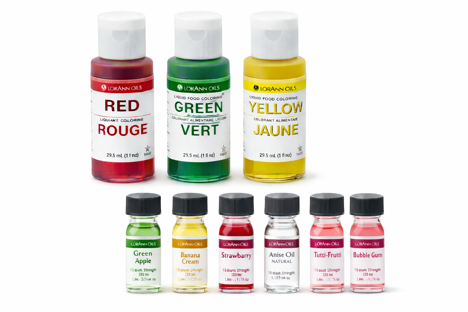 Dette sæt samler 3 flydende fødevarefarver og 6 koncentrerede aromaer fra LorAnn Oils – ideelt til dig, der arbejder med kager, konfekt, chokolade, is og andre søde projekter, hvor både farve og smag skal være præcis og intens.