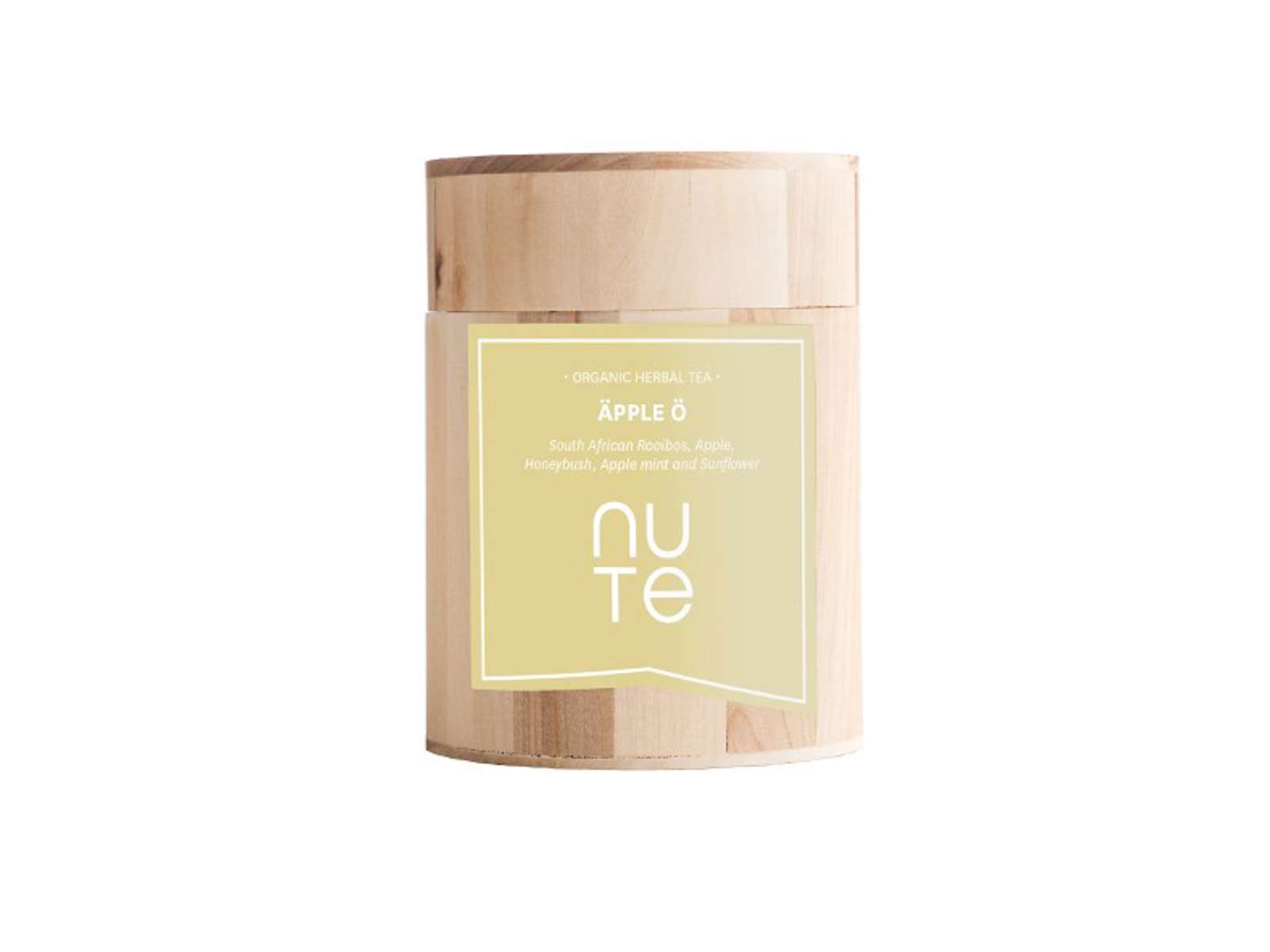Lad dig forføre af en varm og frugtrig kop med NUTE Äpple Ö – en økologisk sydafrikansk rooibos med æblestykker, honeybush, æblemynte og solsikke.