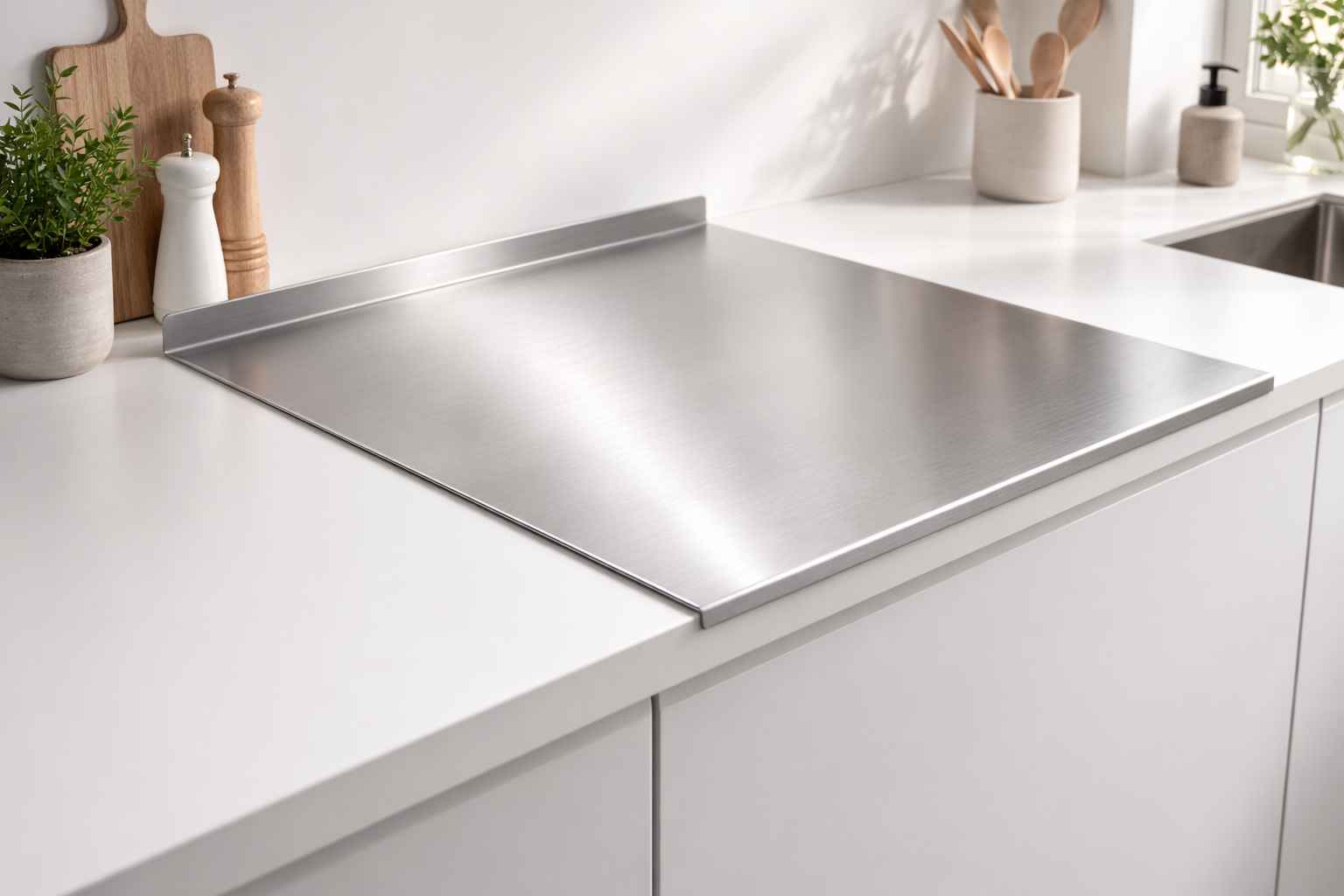 Denne praktiske bordplade i rustfri stål er ideel til bagning, madlavning og køkkenarbejde, hvor hygiejne og holdbarhed er i fokus.