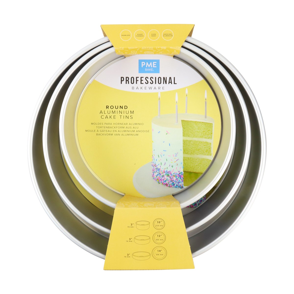 Bageformene har en højde på 7,5 cm og måler Ø 25,4 cm, Ø 30,5 cm og Ø 35,6 cm.