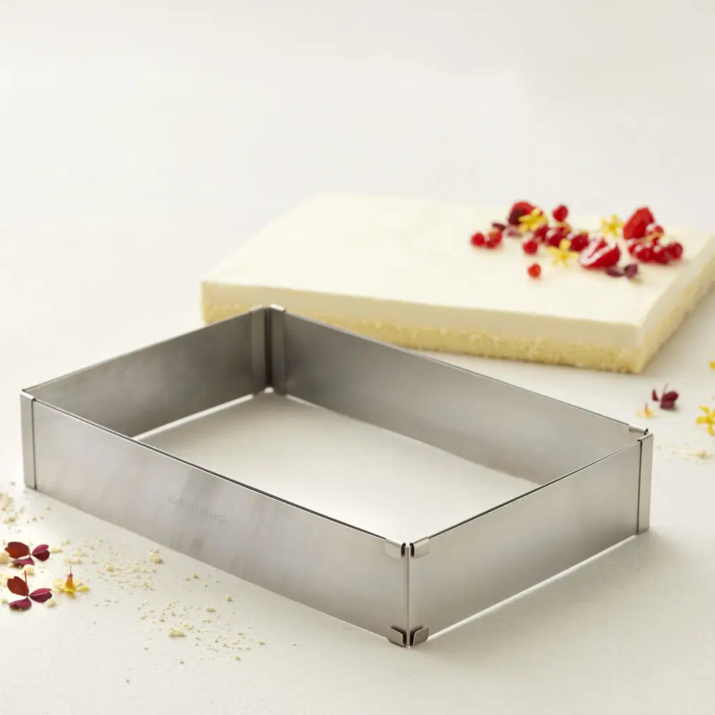Rammen er 5 cm høj og kan justeres i både længde og bredde, så du kan tilpasse den til præcis den størrelse, du har behov for til dit bagværk og dine støbte desserter.