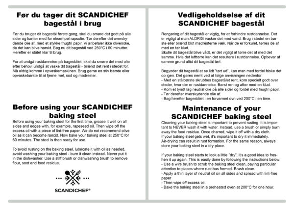 ScandiChef Bagestål Pro måler 35 × 40 cm og er laserskåret af massivt stål. Fremstillet i Danmark med præcision og omtanke. Overfladen er sandblæst, hvilket sikrer optimal kontakt med dejen og giver jævne og sprøde resultater – hver gang.