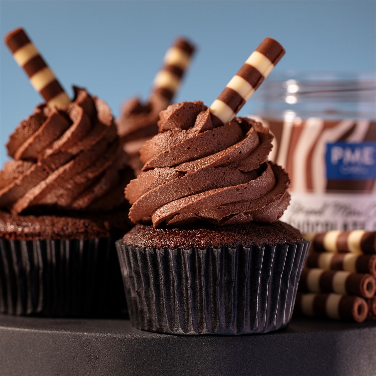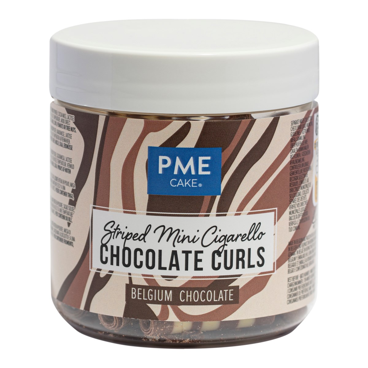 Tilføj et elegant og lækkert touch til dine desserter med disse smagfulde Belgiske chokoladekrøller fra PME. De fine, stribede cigarellos er perfekte som pynt på cupcakes, kager, desserter og meget mere – drys dem over is, varm kakao eller en latte for en smuk og delikat finish.