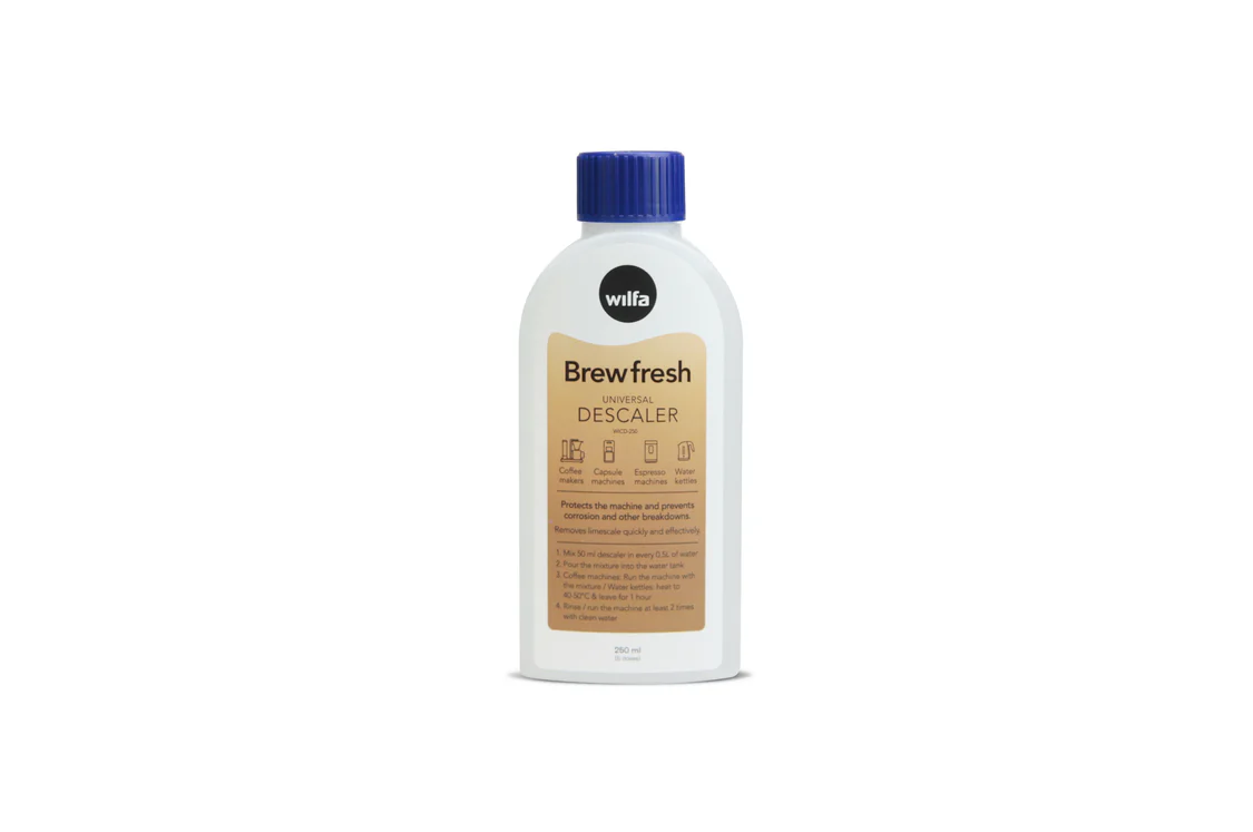 Kalk kan hurtigt ophobe sig i maskiner, der bruges dagligt. Brewfresh Universal Afkalker opløser effektivt kalkaflejringer og hjælper med at holde maskinens indvendige dele rene og velfungerende. Flasken indeholder 250 ml, hvilket rækker til op til 5 doser, så du har en praktisk løsning til regelmæssig vedligeholdelse.
