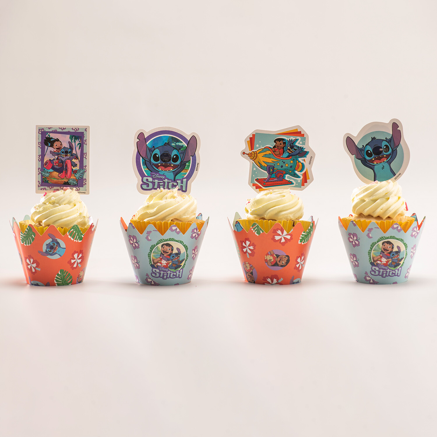 Giv dine cupcakes et sødt og festligt udtryk med dette dekorationskit i Stitch-tema – perfekt til børnefødselsdage og temafester.