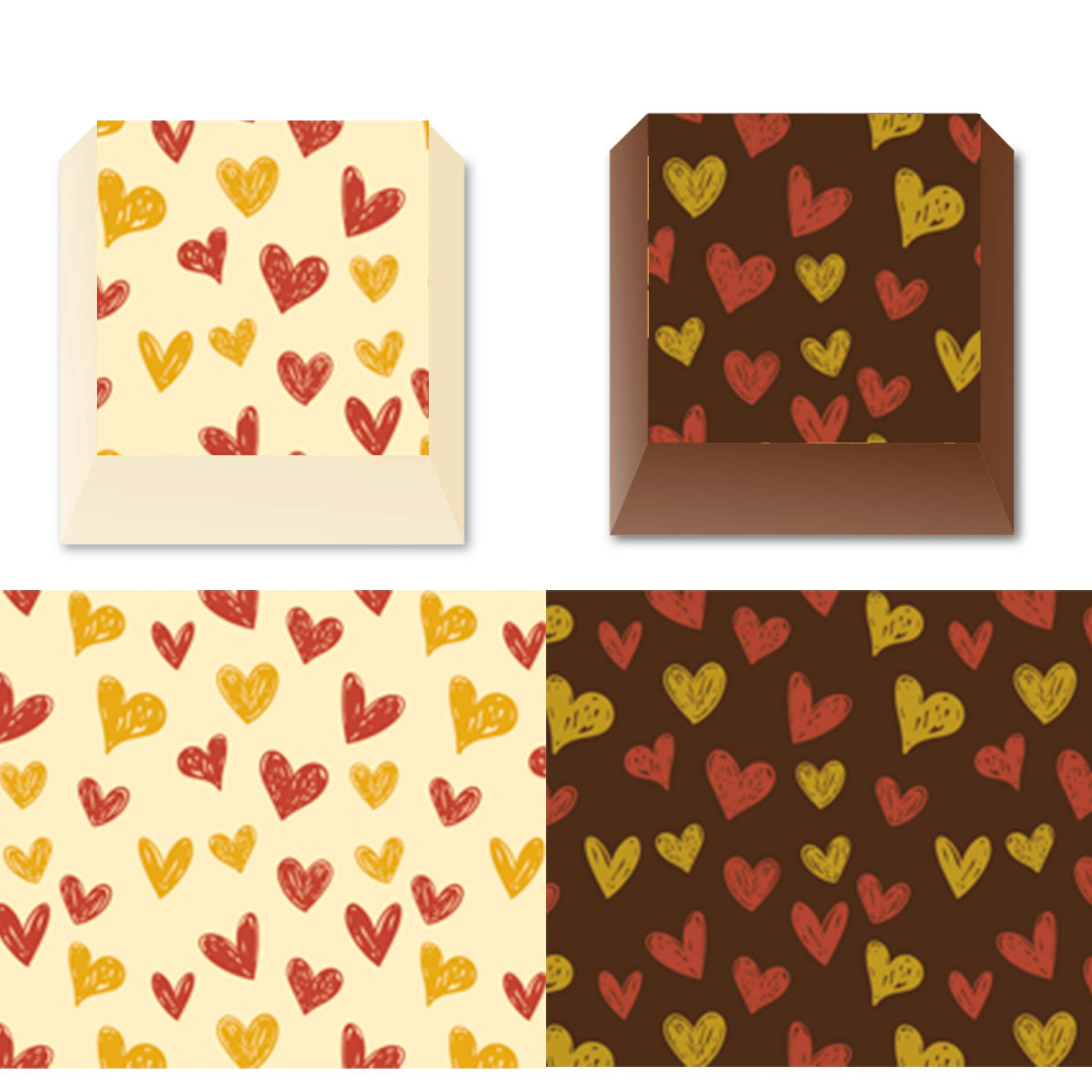 Se på billederne hvordan dette print vil se ud på hvid og mørk chokolade. Bemærk at chokoladen uanset om det er mørk, lys eller hvid skal være korrekt tempereret, ellers vil arkets print ikke hæfte på chokoladen.