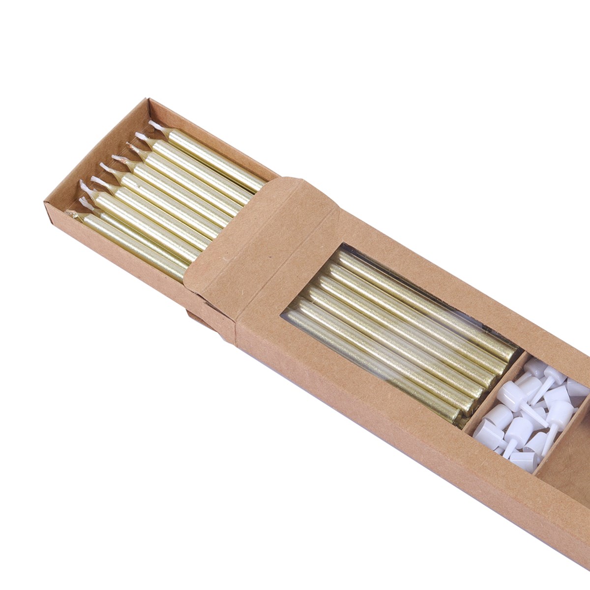 Pakken indeholder 16 slanke vokslys i skinnende guld samt tilhørende hvide plastikholdere, som gør det nemt og sikkert at placere lysene på kagen.
