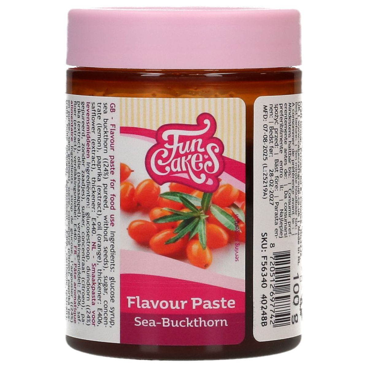 Ingredienser: glukosesirup, havtorn (24%) (moset, uden kerner), sukker, koncentrat (citron), paprikaekstrakt, olie (appelsin), fortykningsmiddel: E406, saflor (ekstrakt), fortykningsmiddel: E440. |