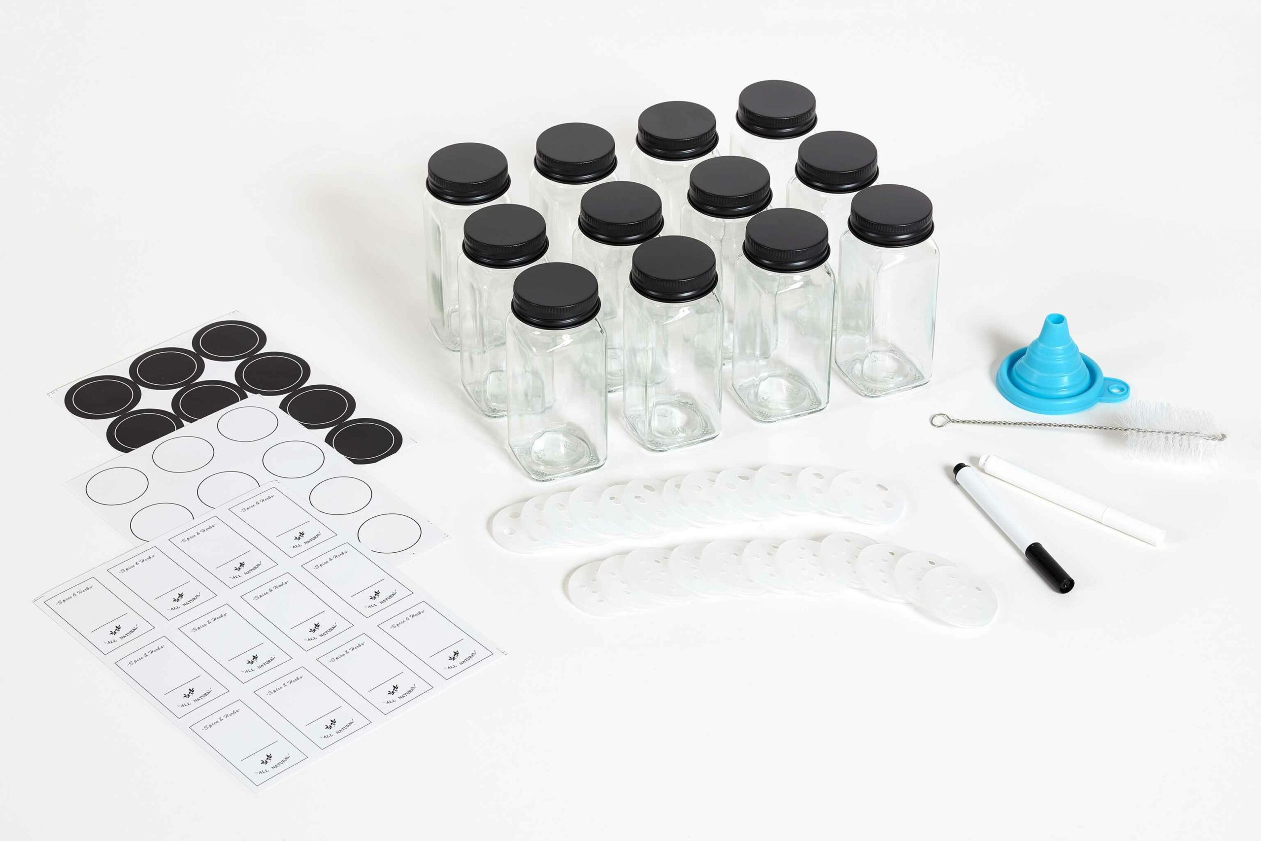 Krydderiglas – sæt med 12 stk, inkl. labels, tuscher, tragt og drysselåg