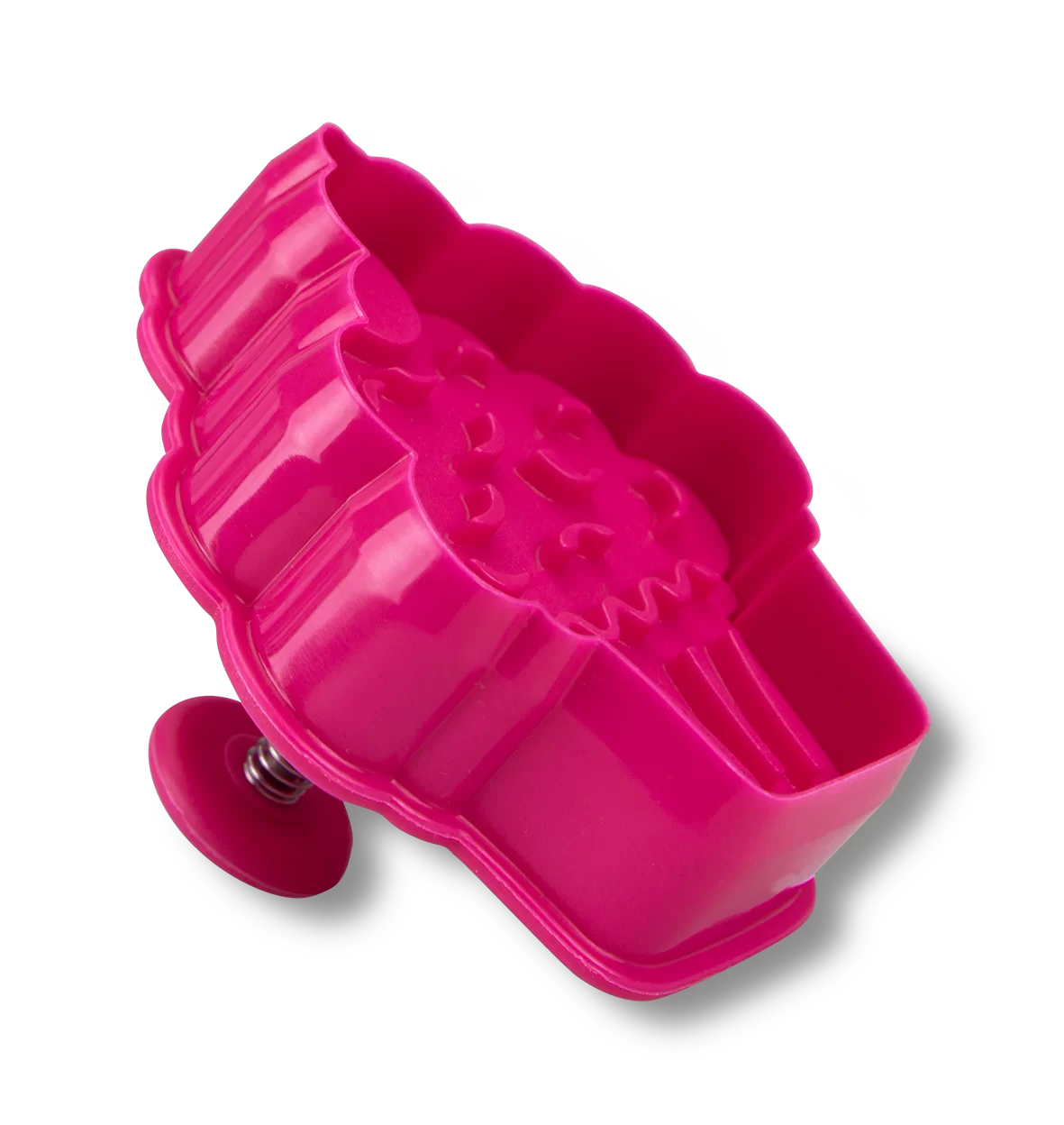 Denne fine muffin-udstikker (6 cm) i pink, fødevaregodkendt plast er både dekorativ og nem at bruge. Den integrerede udløser gør det let at flytte figuren over på bagepladen uden at beskadige de fine detaljer – og prægningen står stadig tydeligt efter bagning.