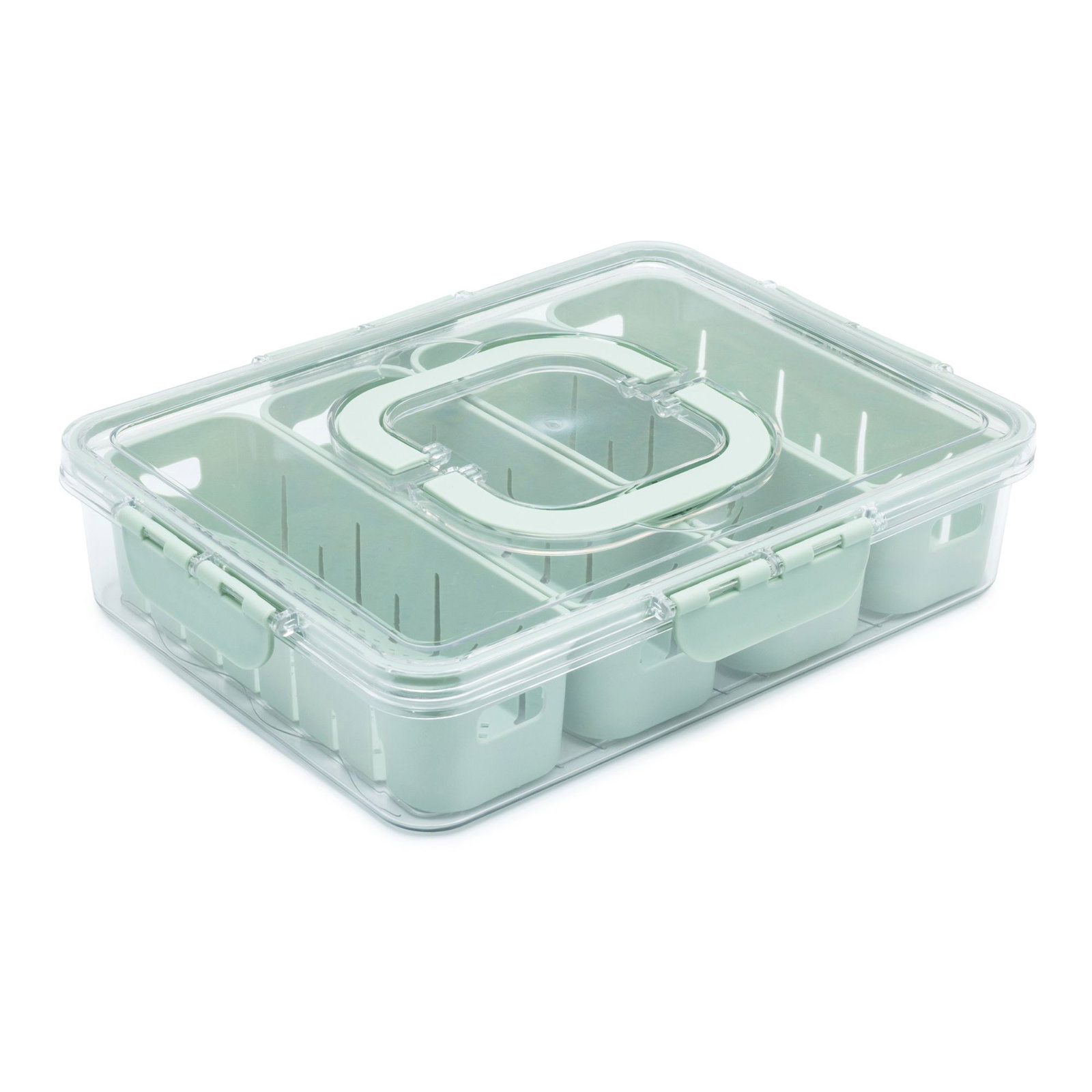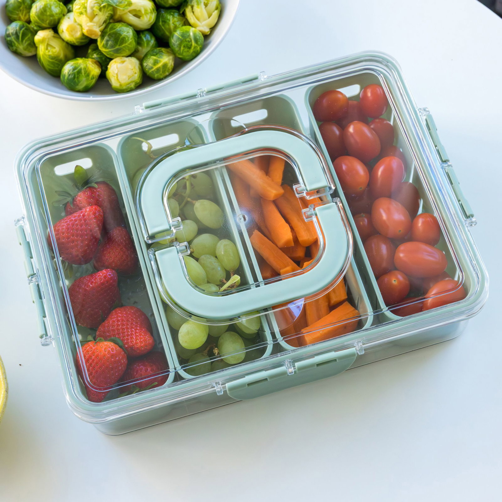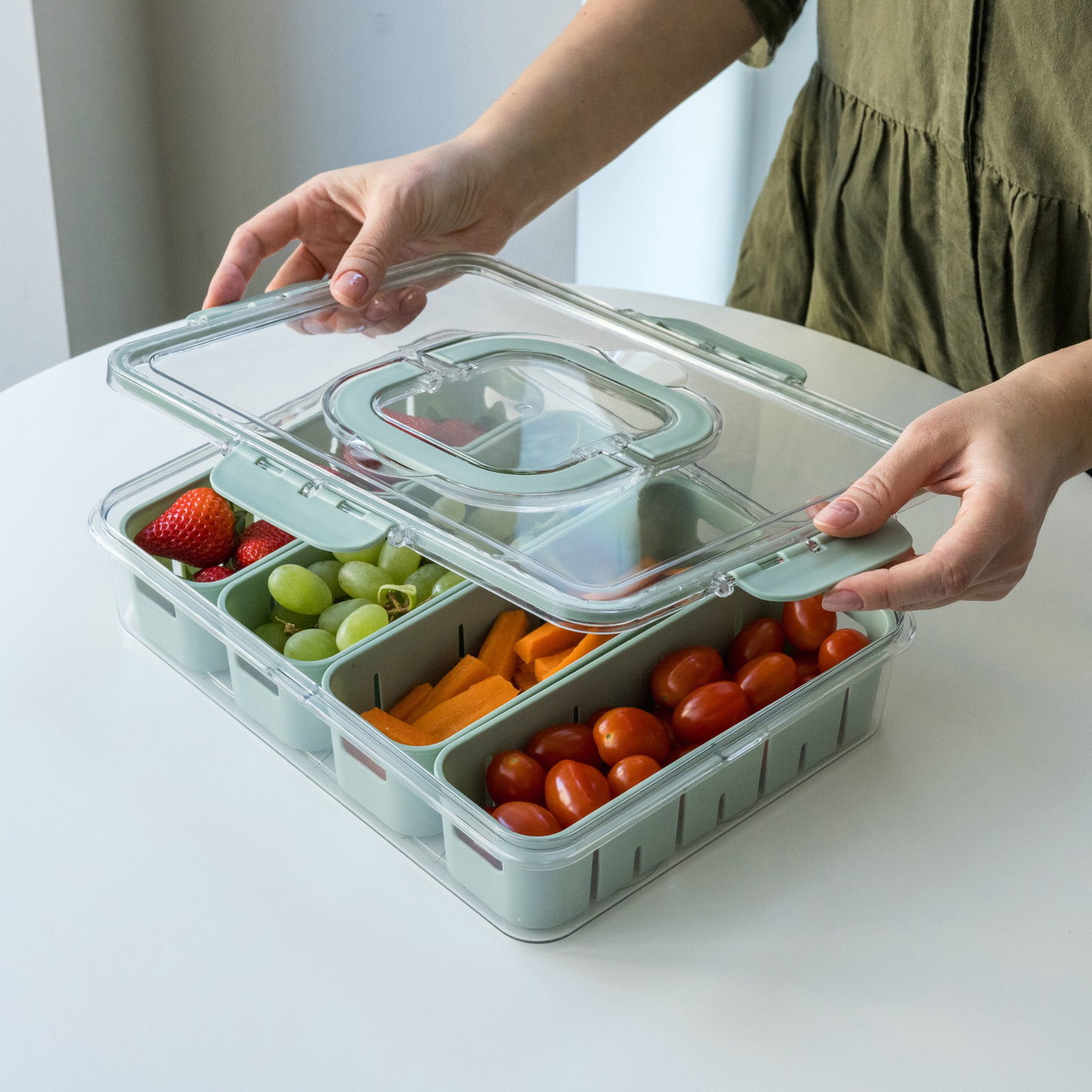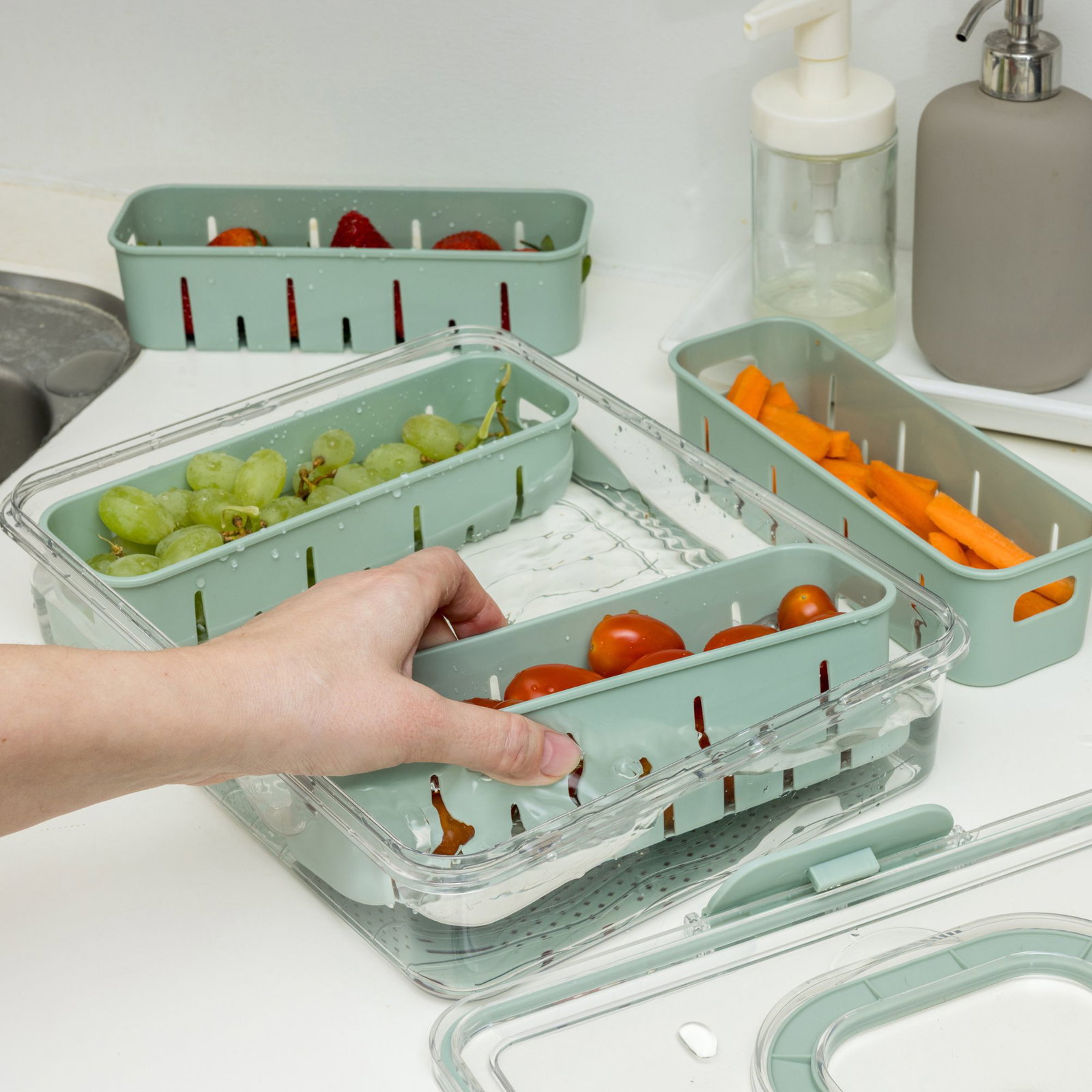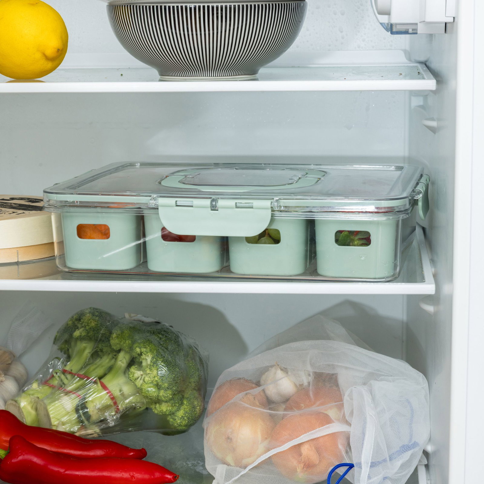 Det gennemsigtige låg giver hurtigt overblik, mens de udtagelige inderbakker gør organisering enkel og fleksibel. Ideel til både køleskab og madforberedelse.