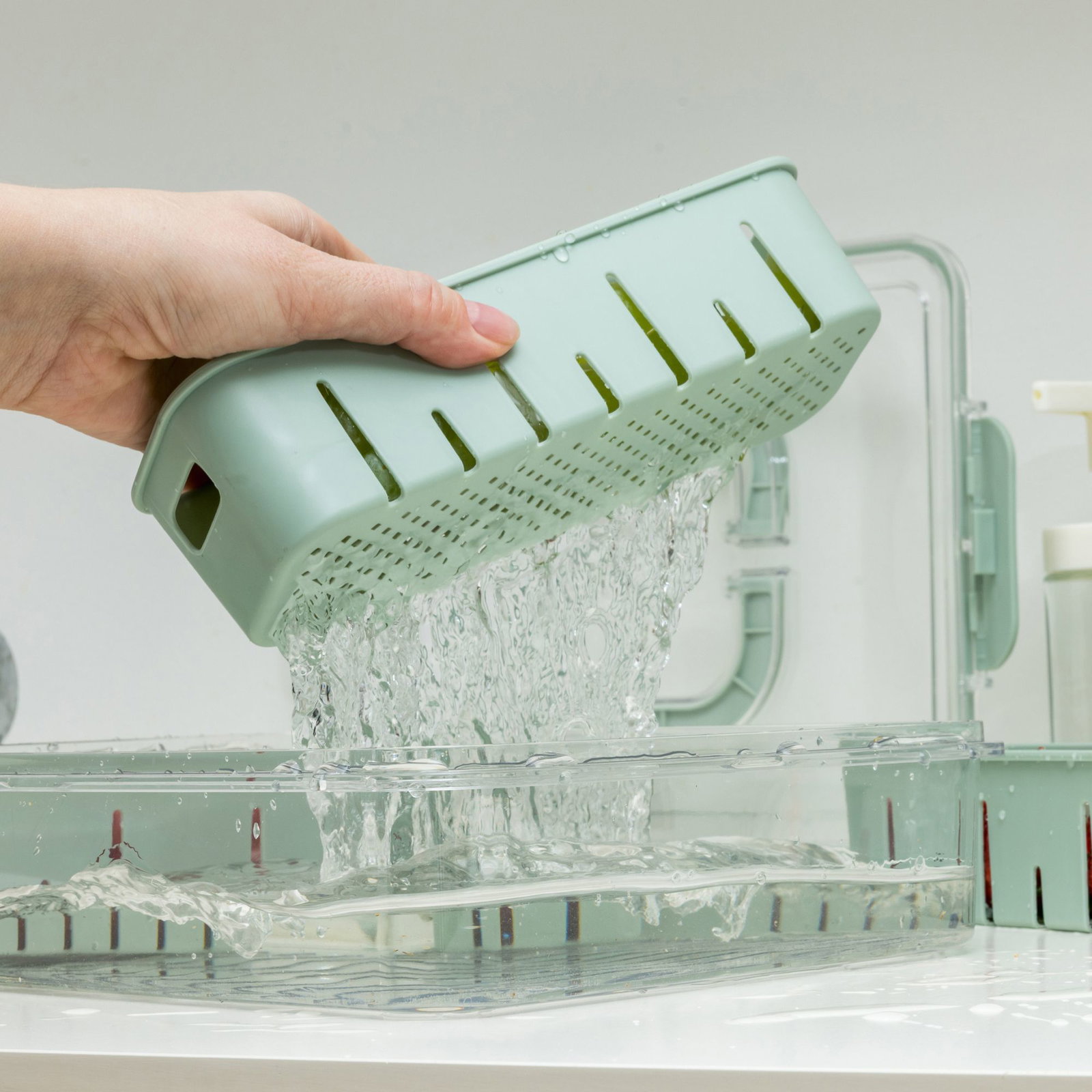 Denne smarte opbevaringsboks er designet med indbygget dræn, så overskydende væske ledes væk – perfekt efter vask af frugt, grøntsager og bær.