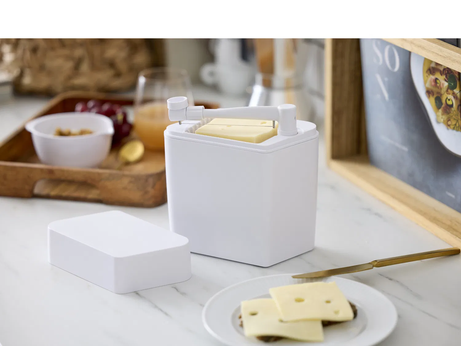 Fremstillet i høj kvalitet og slidstærk plast, der sikrer lang holdbarhed og nem rengøring. Den klassiske hvide farve matcher den originale osteboks og bevarer det enkle, tidløse design.