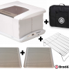 Folding Proofer and Slow Cooker, som indeholder basen med varmeplade og styring, foldbare sider, låg, bundrist, fordampningsskål, netledning og dansk manual.