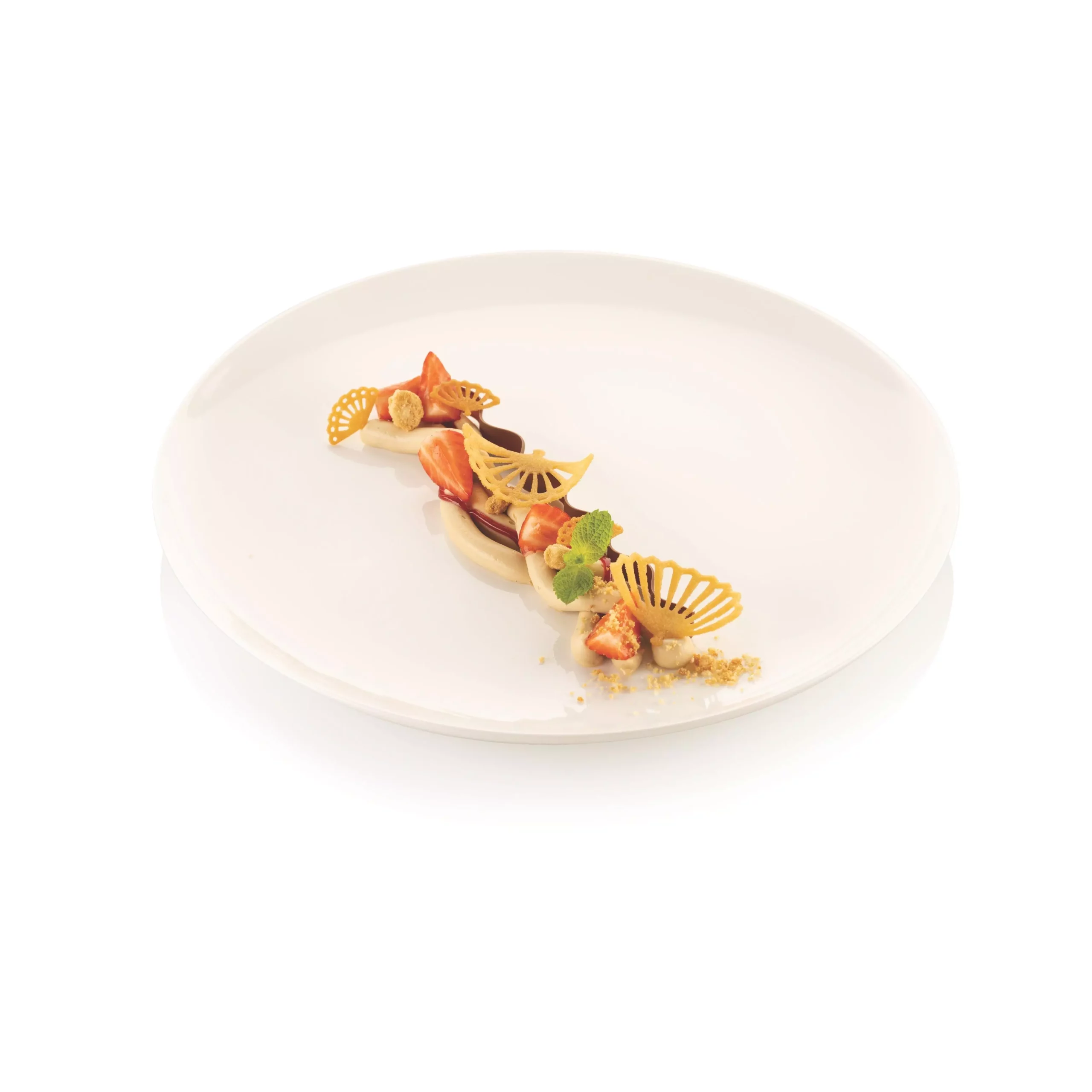De tynde og detaljerede dekorationer kan fremstilles i både pâte à cigarette og chokolade og er perfekte til portionsdesserter, tallerkenanretninger og eksklusive gourmetpræsentationer. For øget fleksibilitet kan silikonemåtten klippes langs de angivne retningslinjer, så den nemt tilpasses forskellige arbejdsbehov i køkkenet.