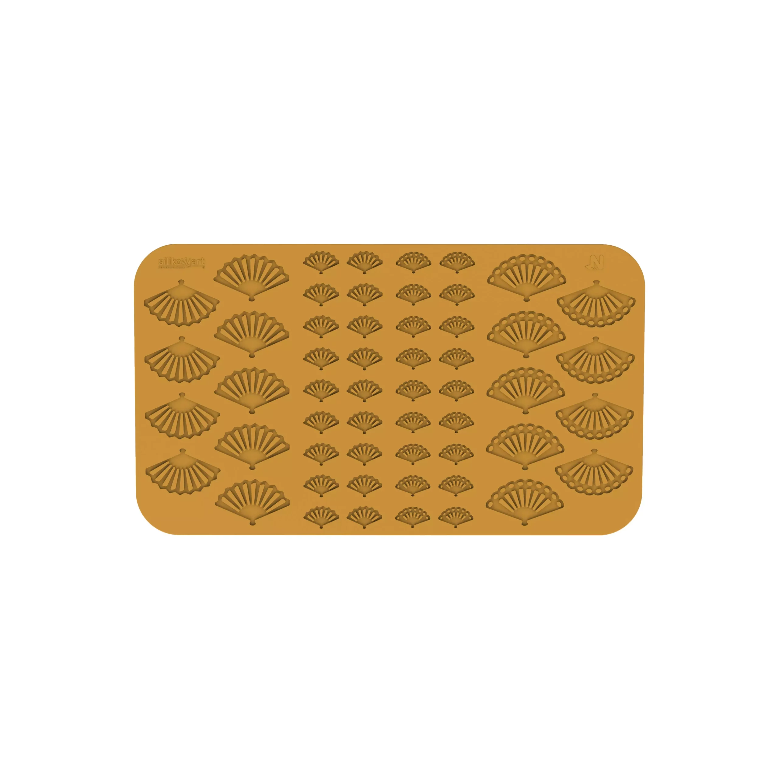 Tilføj et markant og elegant visuelt udtryk til dine kreationer med denne silikonemåtte med vifteformede dekorationer. Måtten indeholder fire forskellige vifteformede motiver, hvis harmoniske geometrier skaber et dramatisk og raffineret look, ideelt til at løfte præsentationen af enhver anretning.