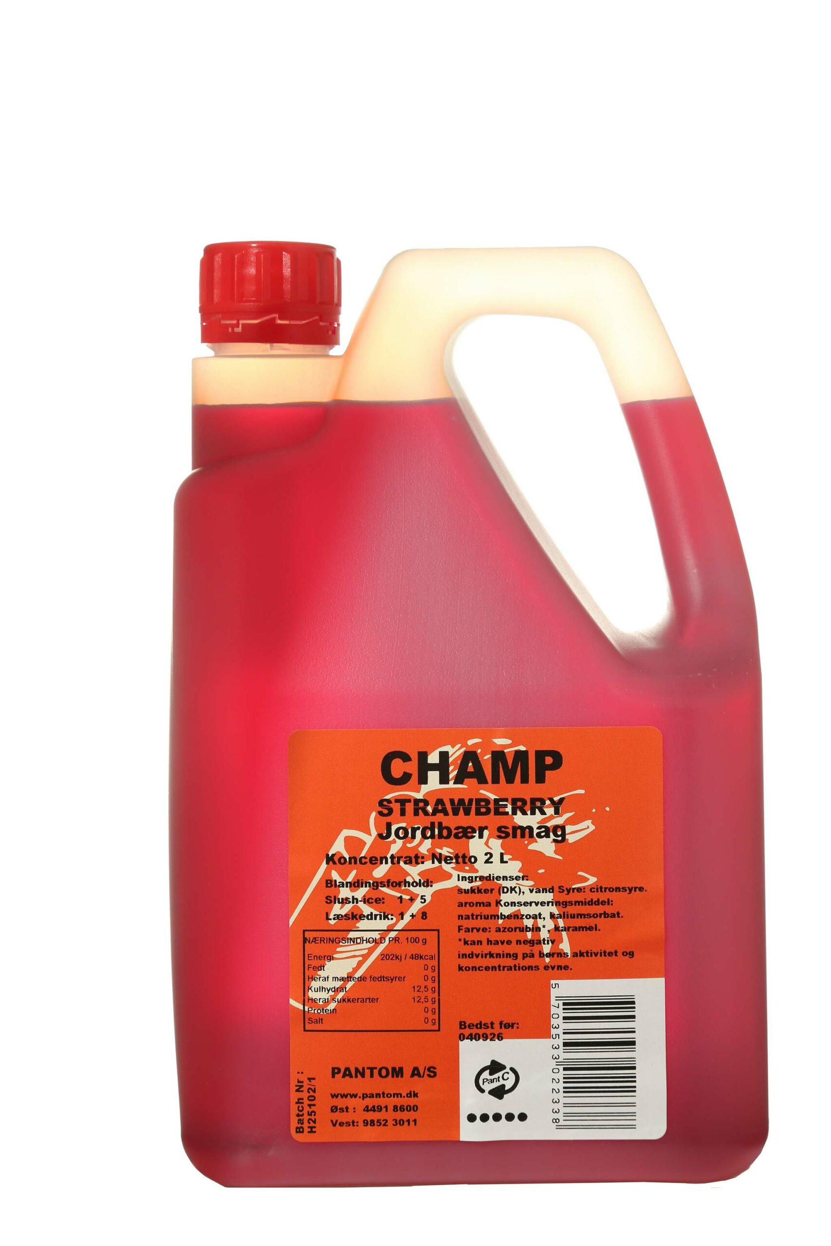 Flasken indeholder 2 L koncentrat  – hvilket giver ca. 12 L slush ice eller 18 L saftevand..