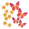 Med dette fine sæt med dekorationer i vaffelpapir, får du 4 sommerfugle i rød/orange nuancer og 35 små blomster i gul.