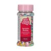 | Ingredienser: sukker, dextrose, stivelse (hvede, majs, ris), rismel, glucosesirup, semulje (hvede), vegetabilsk olie og fedt (kokos, raps), farve: E100, E101, E131, E132, E133, E160a, fortykningsmiddel: E413, E414, koncentrat (æble, brombær, radise, citron, tidsel, spirulina, rødbeder), overfladebehandlingsmiddel: E901, E903, E904, surhedsregulerende middel: E330, salt, klid (majs), maltodextrin, smagsstof, antiklumpningsmiddel : E553b, emulgator: E322. For allergener, se ingredienser med fed skrift. Kan indeholde spor af: jordnødder, soja, mælk, nødder. OBS: Kernen i en del af denne Medley består af semulje. Dette sikrer den smukke og faste form, men gør også drysset ret hårdt. |