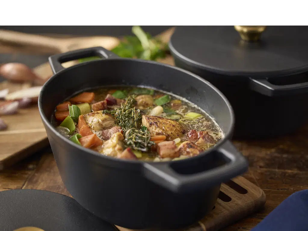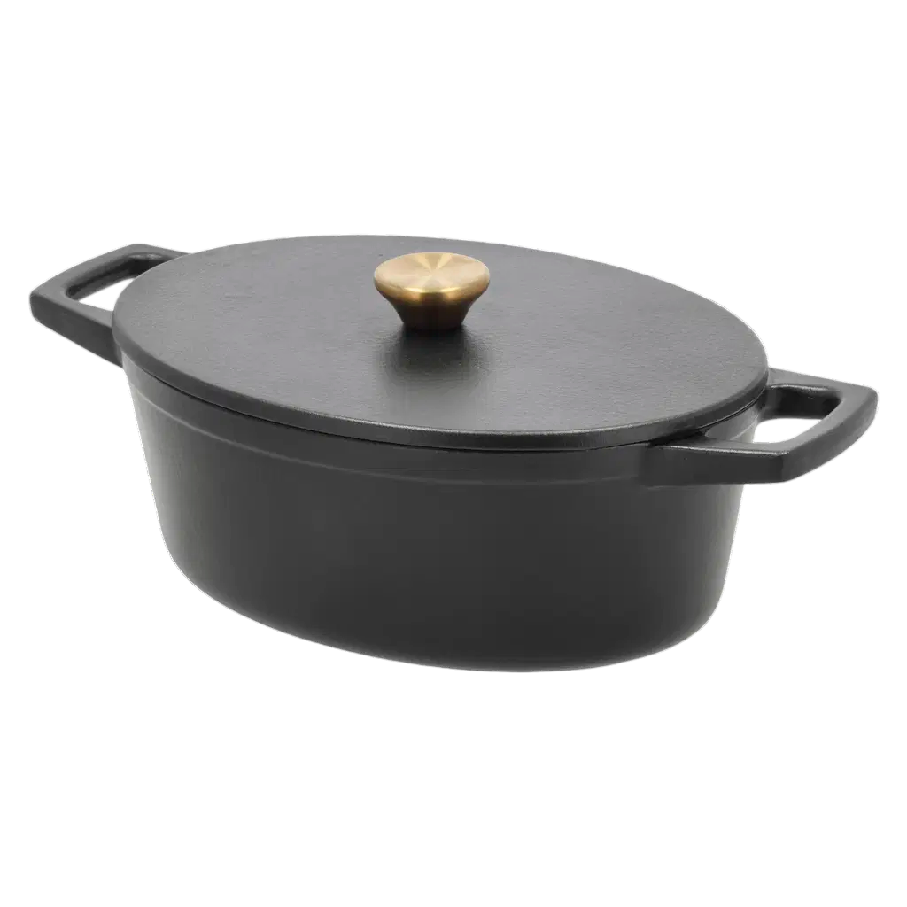 Støbejernsgryde, 3,8 liter, med en 3-lags mat sort emaljecoating.