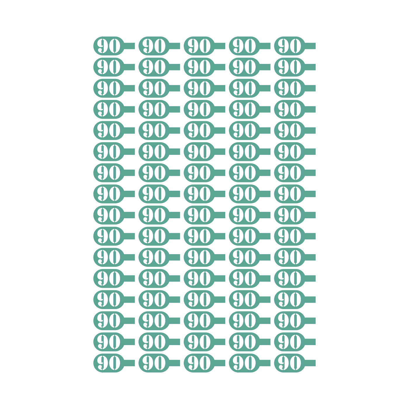 Hvert klistermærke måler 22,3 x 13,5 mm. Tallet måler 10×16 mm.