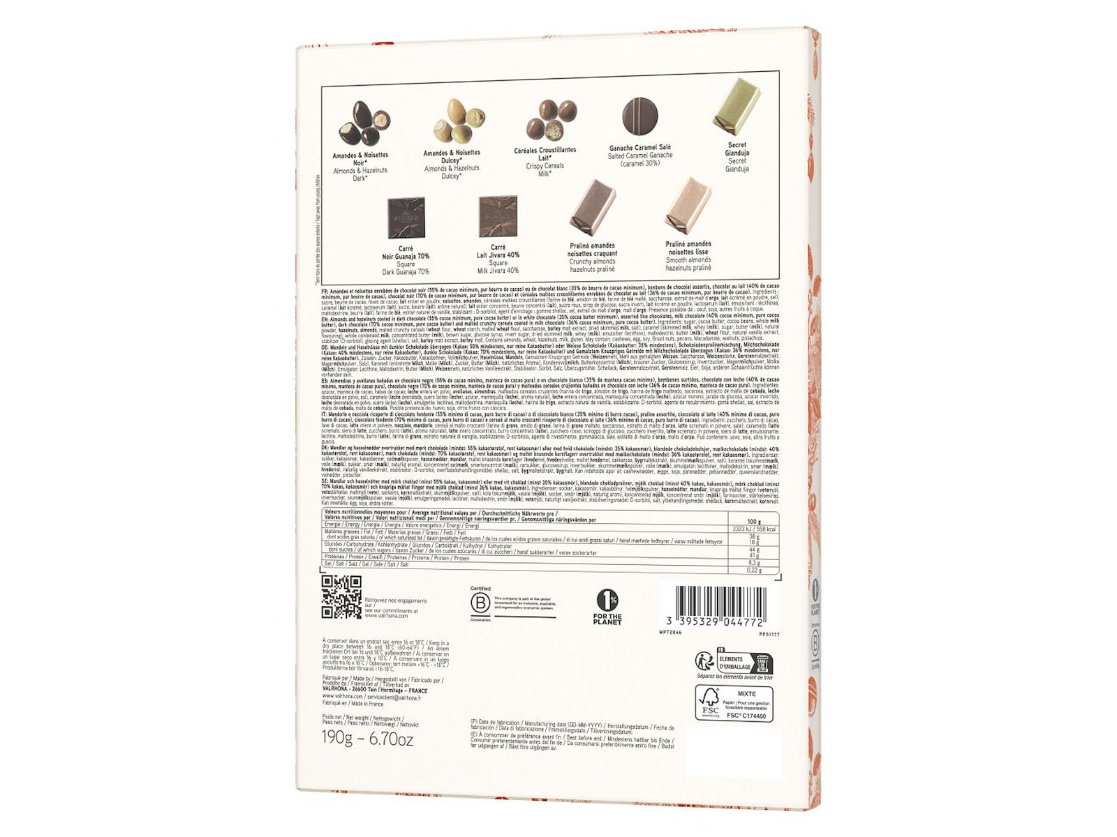 | Ingredienser: sukker, kakaosmør, kakaobønner, sødMÆLKspulver, HASSELNØDDER, MANDLER, maltet knasende kornflager (HVEDEmel, sakkarose, maltet HVEDEmel, HVEDEstivelse, BYGmaltsekstrakt, skummetMÆLKspulver, salt) karamel (skummetMÆLK, valle (MÆLK), sukker, smør (MÆLK) naturlig aroma), koncentreret sødMÆLK, smørkoncentrat (MÆLK), rørsukker, glucosesirup, invertsukker, skummetMÆLKspulver, valle (MÆLK), emulgator: lecithiner, maltodekstrin, smør (MÆLK), HVEDEmel, naturlig vanilleekstrakt, stabilisator: D-sorbitol, overfladebehandlingsmiddel: shellac, salt, BYGmaltekstrakt, BYGmalt. Kan indeholde spor af æg, cashewnødder, sojo, paranødder, pekannødder, queenslandnødder, valnødder, pistacie. |