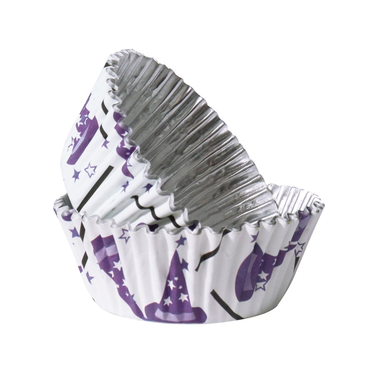 Hver pakke indeholder 30 cupcakeforme i lilla og hvid med tryk af troldmandshatte og stjerner. Formene måler 50 x 28 mm og er fremstillet af kraftigt papir med metalfolieforing, som forhindrer fedtpletter og sikrer et smukt og professionelt resultat.